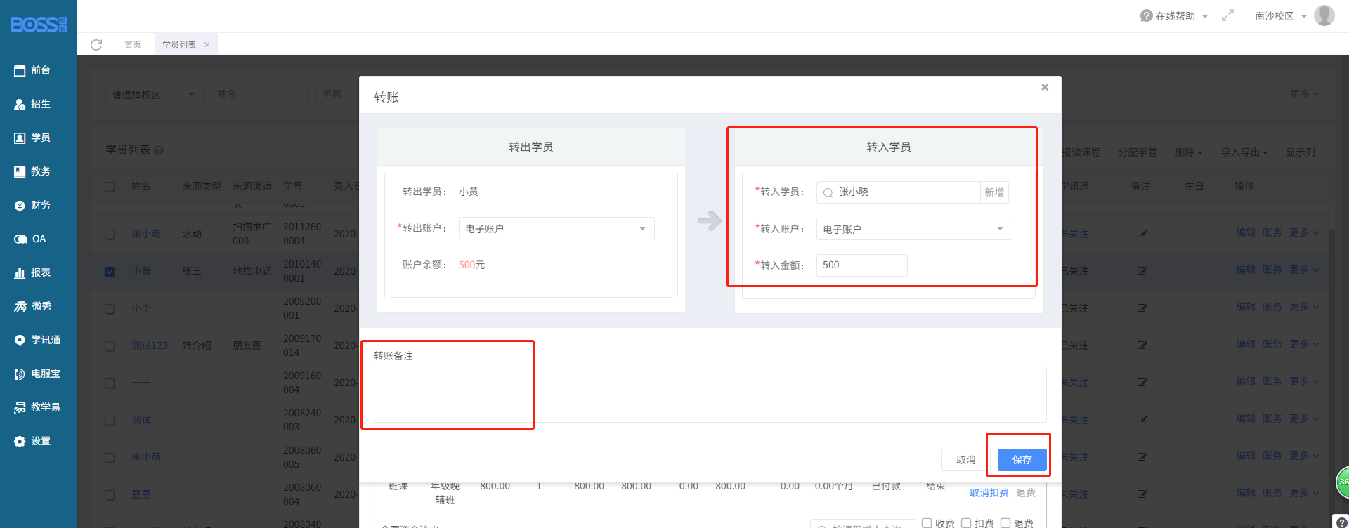 2、选择转入学员、输入转入金额,写明转账备注点击【保存】按钮进行保存