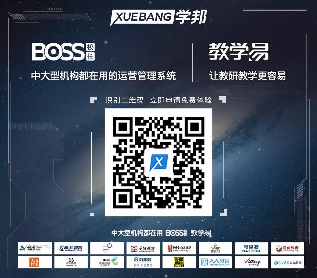 学邦技术五大系统BOSS校长、教学易、学讯通、微秀、电服宝,重度垂直于教培行业的全系统SaaS服务,行业首家通过ISO27001信息安全认证和知识产权管理体系认证,并获国家高新技术企业认证。